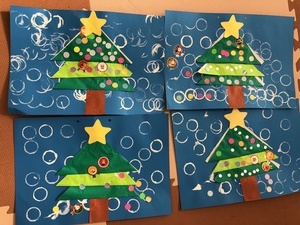 折り紙のツリーに、ラップの芯のスタンプで雪を降らせます。